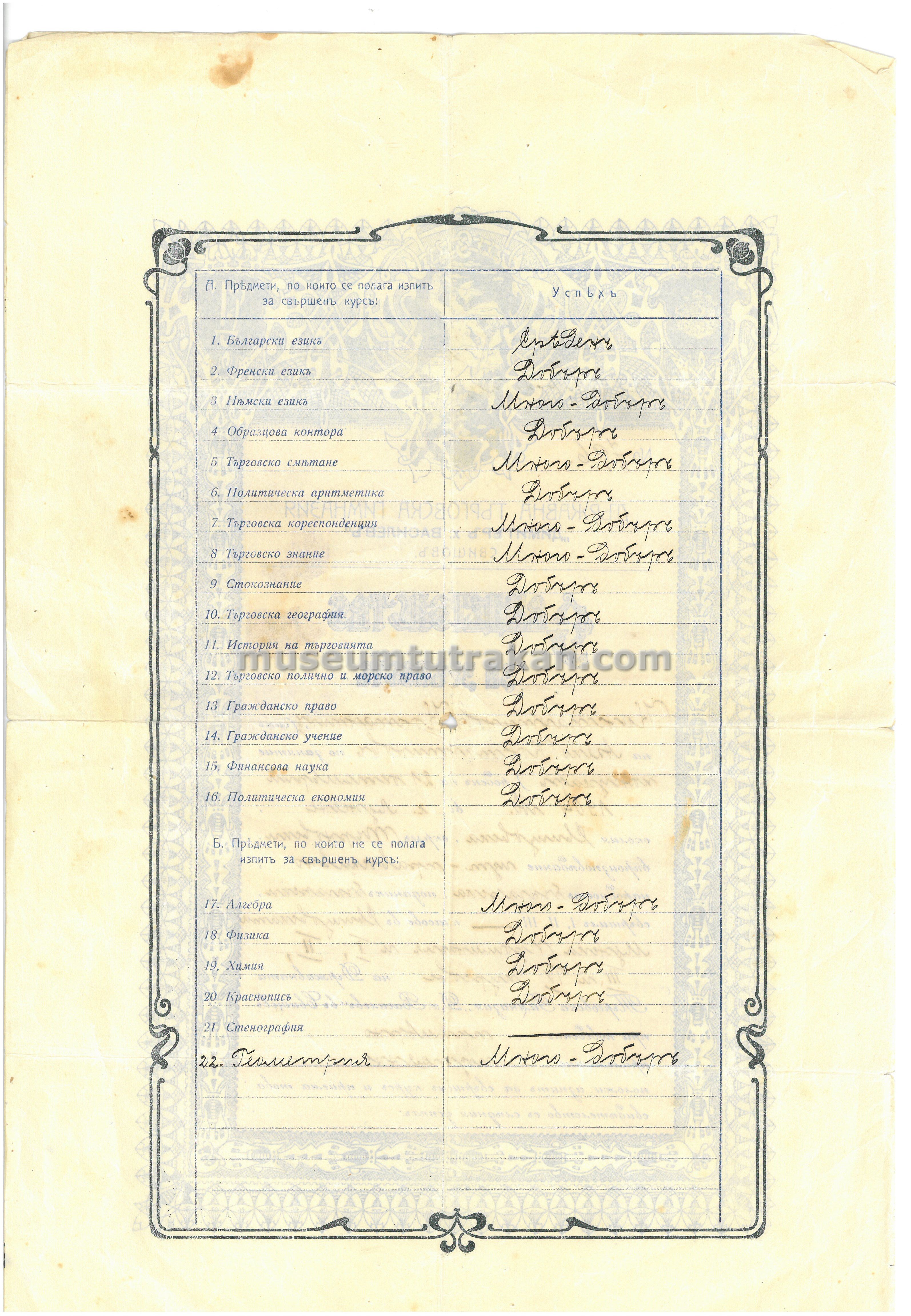 - Свидетелство за зрелост на Константин Константинов, издадено от Държавна търговска гимназия „Димитър х. Василев” – Свищов
